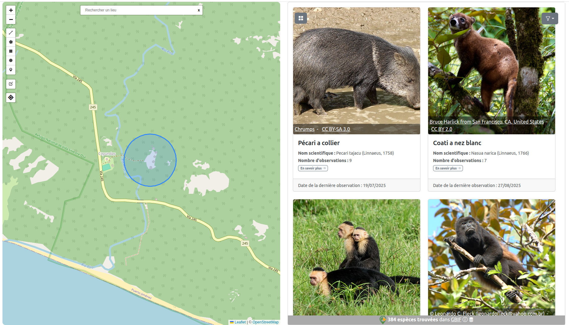 Un widget open source pour afficher les espèces observées dans n’importe quelle zone dans le monde (point, ligne, polygone ou géolocalisation), à partir de sources ouvertes (GBIF, GeoNature…).